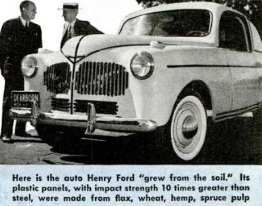 In December 1941, Popular Mechanics ran a story featuring a photograph of Henry Ford standing next to the car he “grew from the soil”. The hemp-ethanol fueled and hemp-resin bodied vehicle was a dream of his but many bills proposing a national agricultural based fuel energy program were killed by smear campaigns launched by vested petroleum interests. One claim put forth was that the U.S. government’s plans “robbed taxpayers to make farmers rich”